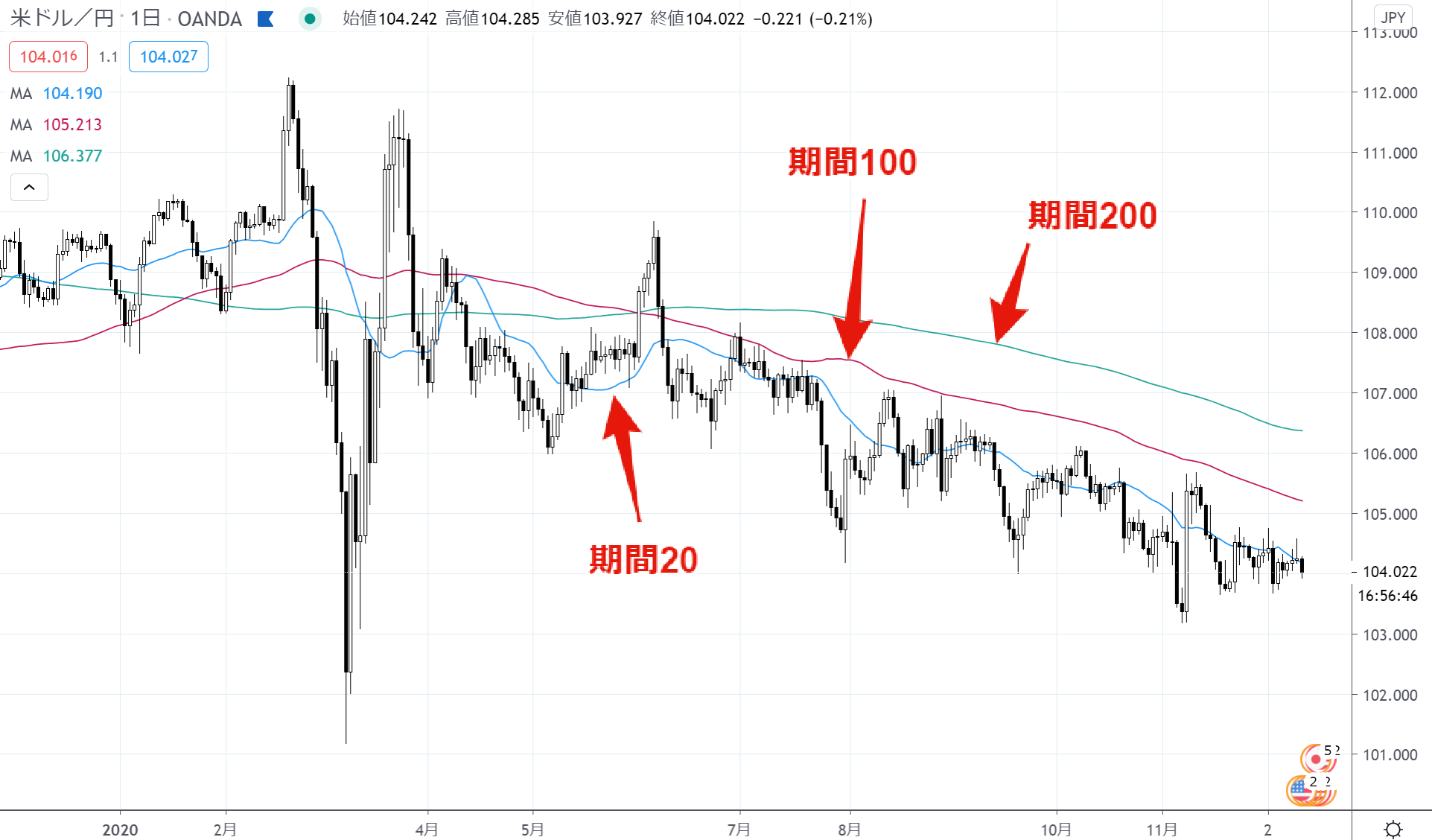 上のチャートはドル円の日足に3本の移動平均線を表示したもので、期間は20・100・200で、ローソク足20本分、100本分、200本分の終値の平均価格になります。