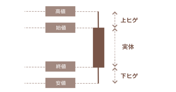 ローソク足は、相場の値動きを時系列に沿って表示します。ローソク足は、実体・上ヒゲ・下ヒゲの3つと4本値の合計7つの要素で構成されています。 単位期間を定め、単位期間中の初めに付いた値段を始値、最後に付いた値段を終値、最も高い値段を高値、最も安い値段を安値といいます。